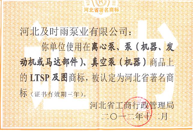 及時(shí)雨品牌被評(píng)為河北省商標(biāo)-河北及時(shí)雨泵業(yè)有限公司